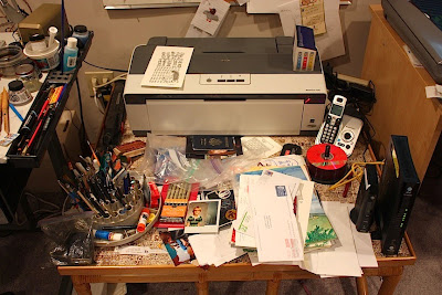 Welcome to Thunderdome! You might find this difficult to believe, but I actually cleaned up before you got here. I’m not kidding. When I’m working, I get so wrapped up on my work that I’m more concerned about the work than the cleaning up down here. But the mess does grow to a point where it becomes hard to find stuff, you can’t walk much without stepping on something, etc. and it actually gets in the way of getting work done. Or my wife gets totally annoyed by it. (We do have to walk through here to get to the laundry room!) Then I have to clean up the place. Having a messy studio can get a little uncomfortable at times. If I get too stressed about it, I think about Francis Bacon’s studio. Then I feel less stressed.